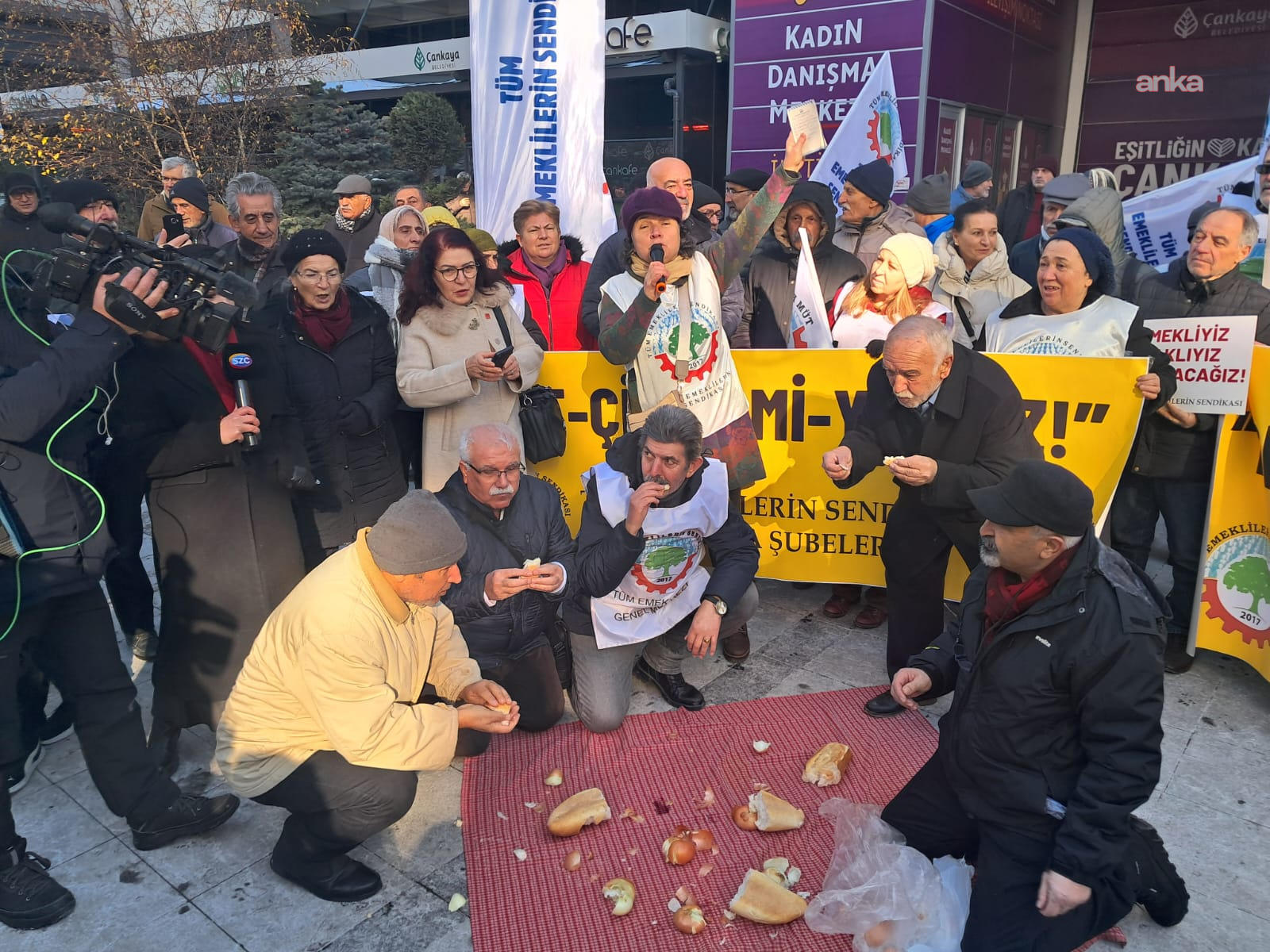 Tüm Emeklilerin Sendikası Ankara Şubeleri, 2026 yılının ilk yarısında emeklilere yapılması planlanan zam oranlarını protesto etmek amacıyla Sakarya Caddesi’nde bir açıklama gerçekleştirdi. Emekliler, artan hayat pahalılığına dikkat çekmek için basın açıklamasının ardından kuru soğan ve ekmek yiyerek geçim sıkıntısına tepki gösterdi.