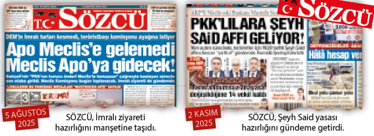 MHP Genel Başkanı Devlet Bahçeli’nin Meclis’te yaptığı açıklamalarla başlayan “Terörsüz Türkiye” sürecinde SÖZCÜ’nün gündeme getirdiği manşetler tek tek ortaya çıkıyor. SÖZCÜ, 5 Ağustos 2025 günü “Teröristbaşı komisyonu ayağına istiyor… Apo Meclis’e gelemedi, Meclis Apo’ya gidecek” manşetini attı. Öcalan Meclis’e gelemedi ancak İmralı ziyaretinin eli kulağında.